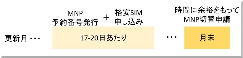 MNPの有効期限は15日ありますので、更新月の17日あたりに発行してもらい、すぐに格安SIMに申し込む必要があります。